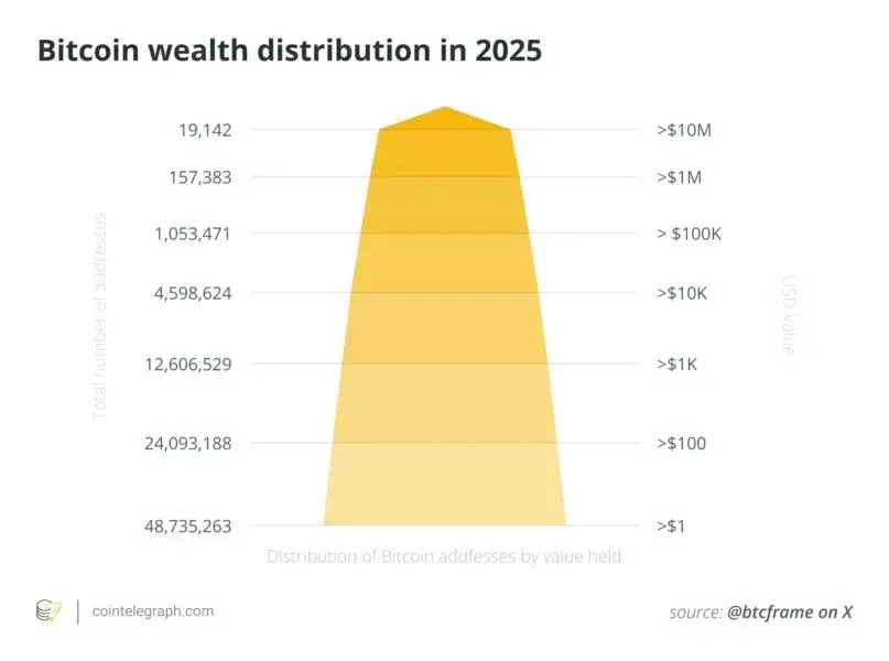 但是,所有權數量的增長並不代表廣泛的去中心化。鏈上數據直觀印證財富集中態勢,巨鯨地址仍佔絕對比重。