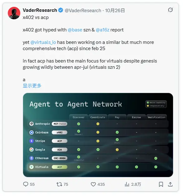 近期,x402協議成為市場熱議焦點。以下將通過對比分析展示ACP協議的優勢,並闡釋Virtuals平台如何在這場智能體能力浪潮中佔據有利位置: