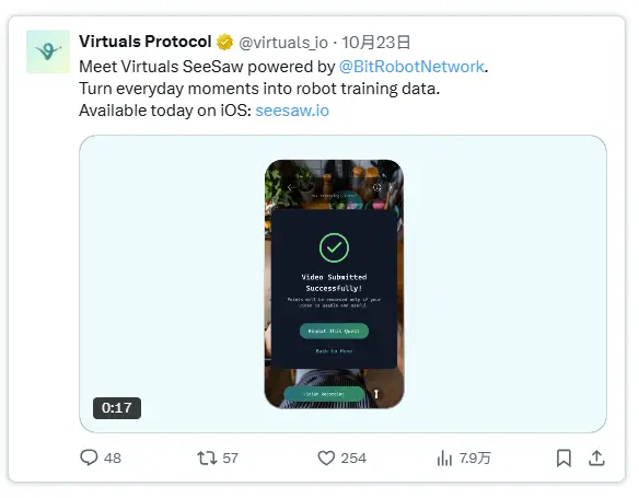 只要獎勵機制與用戶貢獻度匹配,SeeSaw平台便能快速擴展規模,為Virtuals構建起海量的視覺交互數據庫,可向所有機器人研發團隊提供服務化輸出。