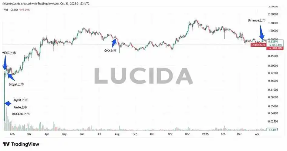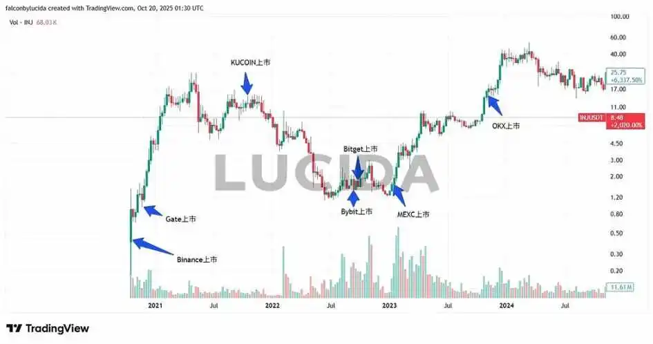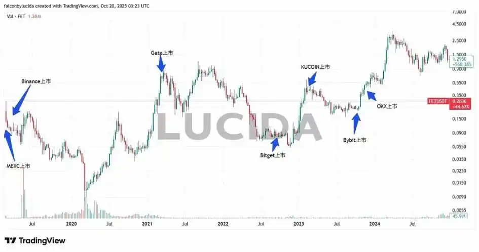 首發於 MEXC 和 Binance,下跌後開啓長牛。Gate 上綫在階段性高點,Bitget 上綫於低位平台後迎來上漲,KuCoin 上綫後即回調,而 Bybit 和 OKX 則在新一輪行情爆發前精準佈局。