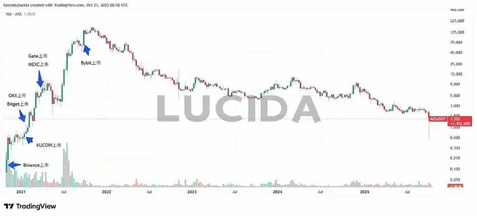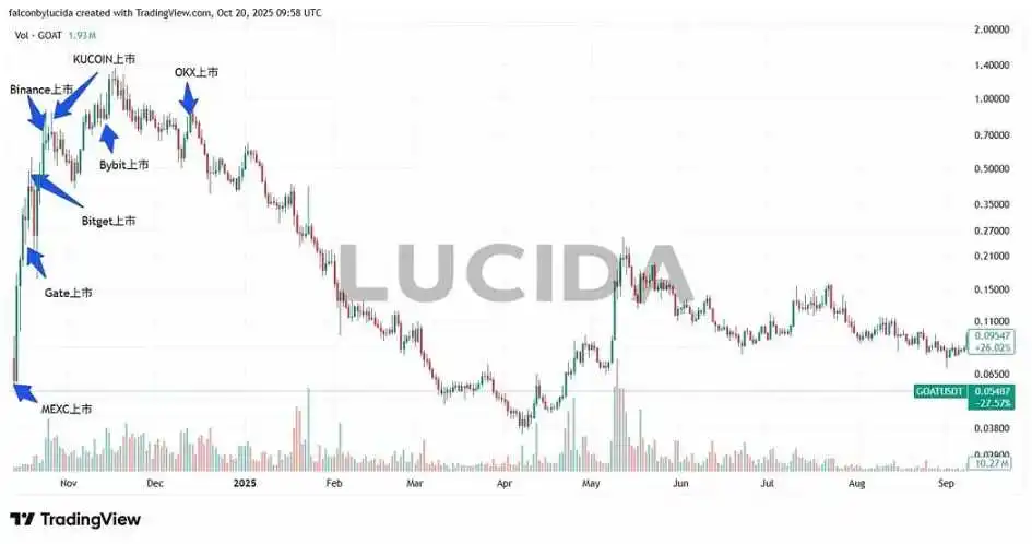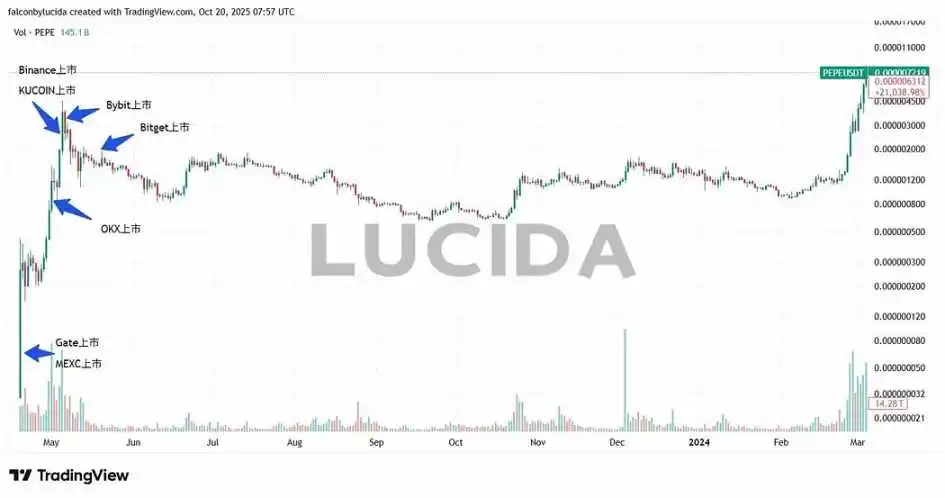 MEXC 首發,並在上漲途中獲 Gate、Bitget、Binance、KuCoin 陸續上綫。當 Bybit 和 OKX 上綫時,盛宴已近散場。