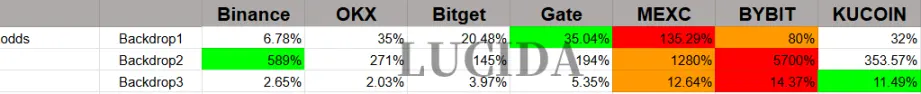 從數據中可以明顯看到,在三個觀察周期中,MEXC和Bybit的賠率表現穩居第一梯隊。換句話說,在這裡,你更有機會用更少的「試錯成本」,捕捉到那些一飛沖天的標的。
