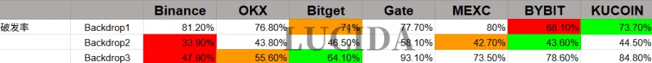 結果顯示,Binance在控制破發率上展現了老大哥的穩健,通常保持最低。Bitget 與 Bybit同樣表現可靠。而 Gate 在三次評比中均未進入前三,需要打新的你多一份警惕。