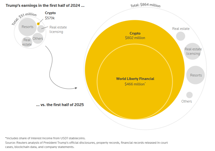PANews 10月29日消息,據路透社報道,根據美國總統特朗普官方披露信息、房産記錄、法庭案件公佈的財務記錄、加密貨幣交易信息及其他來源計算得出,今年上半年,特朗普集團的收入從一年前的5100萬美元飙升至8.64億美元,漲幅達17倍。上半年的總收入中,有8.02億美元(佔比超90%)來自特朗普的加密貨幣項目,包括World Liberty Financial(WLFI)代幣的銷售。這8.64億美元的收入是實際收入,即實實在在、毫無阻礙地流入特朗普家族金庫的現金。