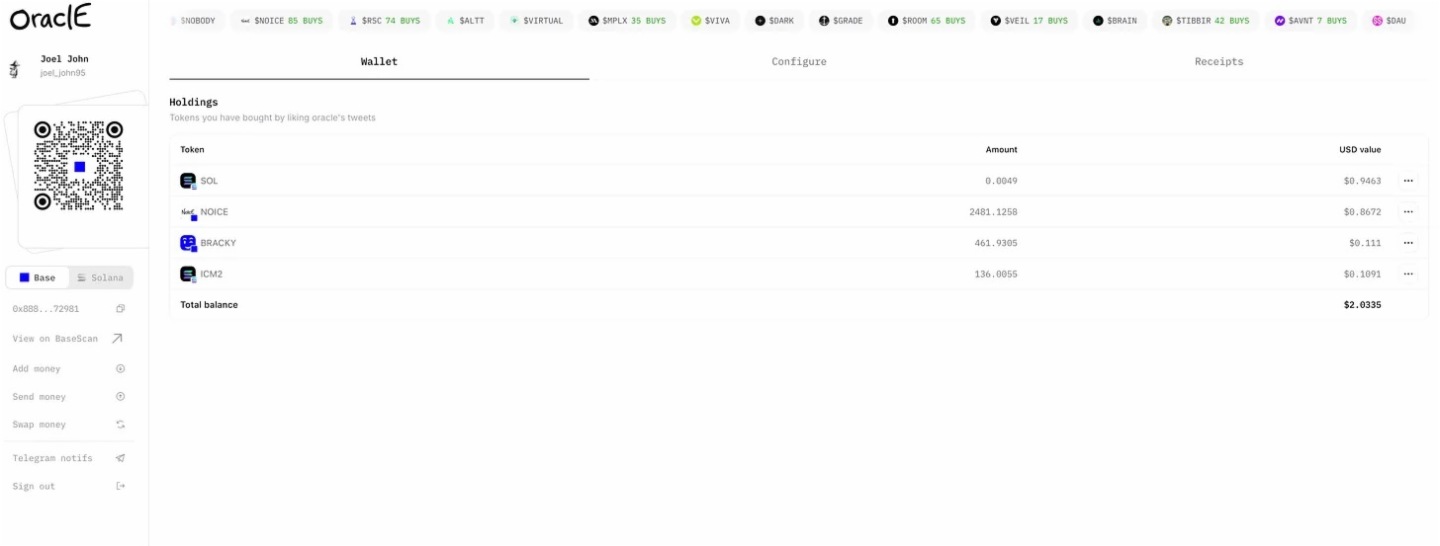 永續合約與錢包的融合預示著未來的趨勢。這是信息流中市場的興起,正見證著注意力轉化為交易所需時間的實時壓縮。若不相信,且看 $noice 開發的 Oracle:用戶一鍵即可購買資産,實際上連第三方平台按鈕都不需要——只需給帶資金標簽的推文點贊,代理程序便會自動完成購買。單次點擊完成交易,成本不足 0.01 美元。這是未來社交網絡的雛形。此産品雖有多處可圈可點,但下面這一點是其最突出的特質。