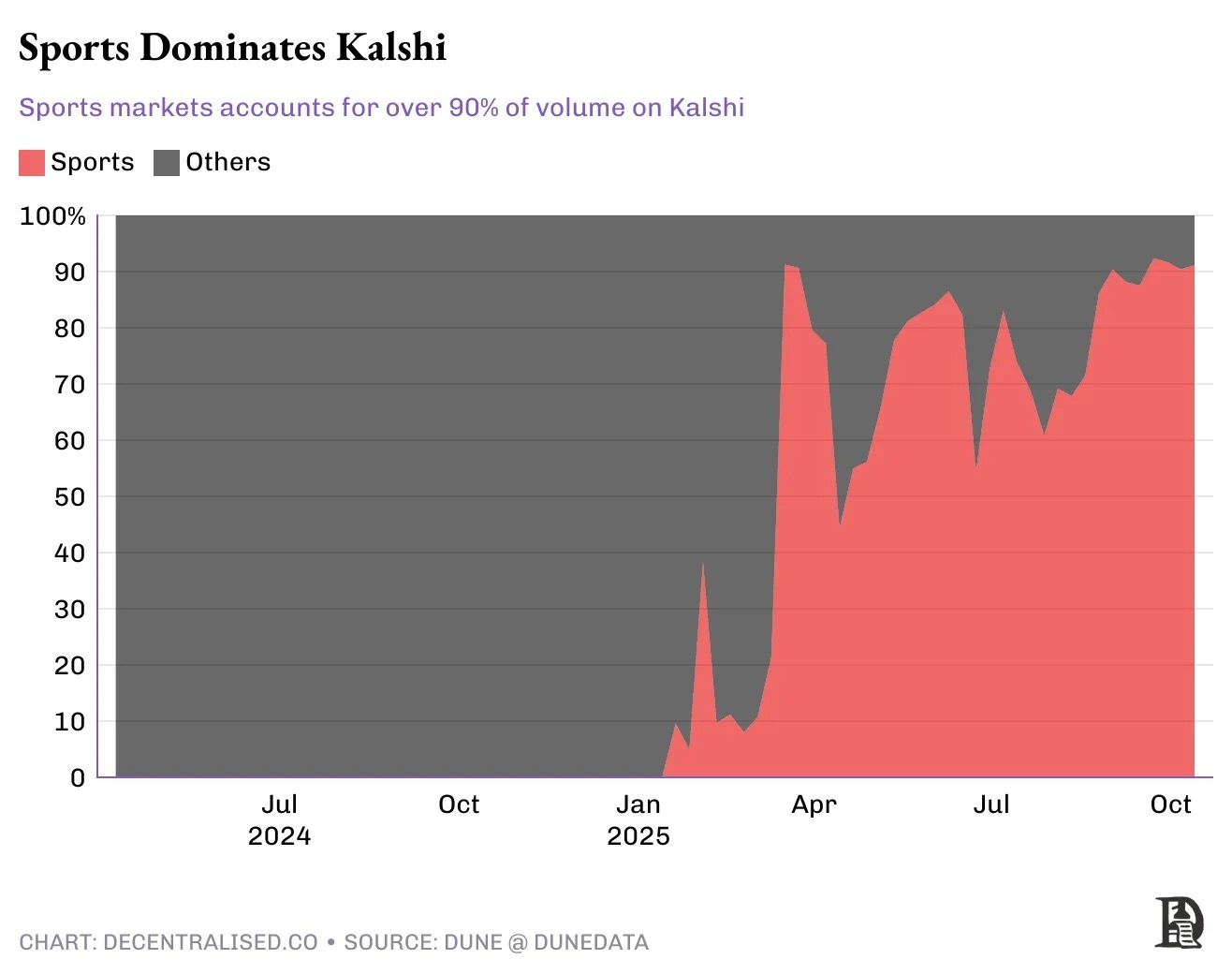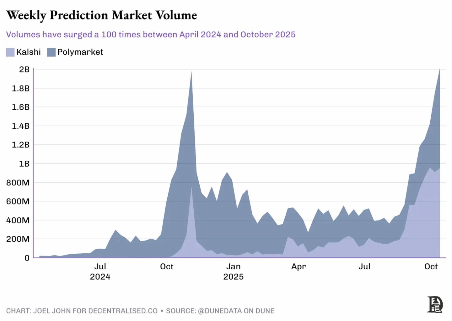 我僅通過給推特點贊,就從信息流裡構建了這個山寨幣指數——這是我在社媒上完成過最輕松的交易。Noice 團隊正在醞釀整個加密領域最具野火的創新。 它允許我們通過再熟悉不過的交互方式——類似推特點贊——即可完成向第三方價值轉移。無需簽署交易、無需刷新錢包、無需跨鏈操作,僅需一次點擊。那麼,其獨特性何在? Farcaster Frames 雖是革命性底層組件,但需依賴尚處萌芽的獨立社交圖譜。而 Twitter 等平台已坐擁海量用戶。通過嵌入式 API 開啓交易,便能直接利用 Twitter 社交圖譜,無需用戶離開平台。 Twitter 對其面臨的變革心知肚明。六月曾有過在其平台嵌入預測市場的動議。雖時隔多月仍未落地,但預測市場已自主爆發式增長。 請看下方兩張圖表:直至 2024 年 4 月,預測市場周交易額僅約 2000 萬美元;而到 2025 年 10 月,該數字已逼近 20 億美元!每周超 600 萬筆交易,平均每筆注額約 300 美元。