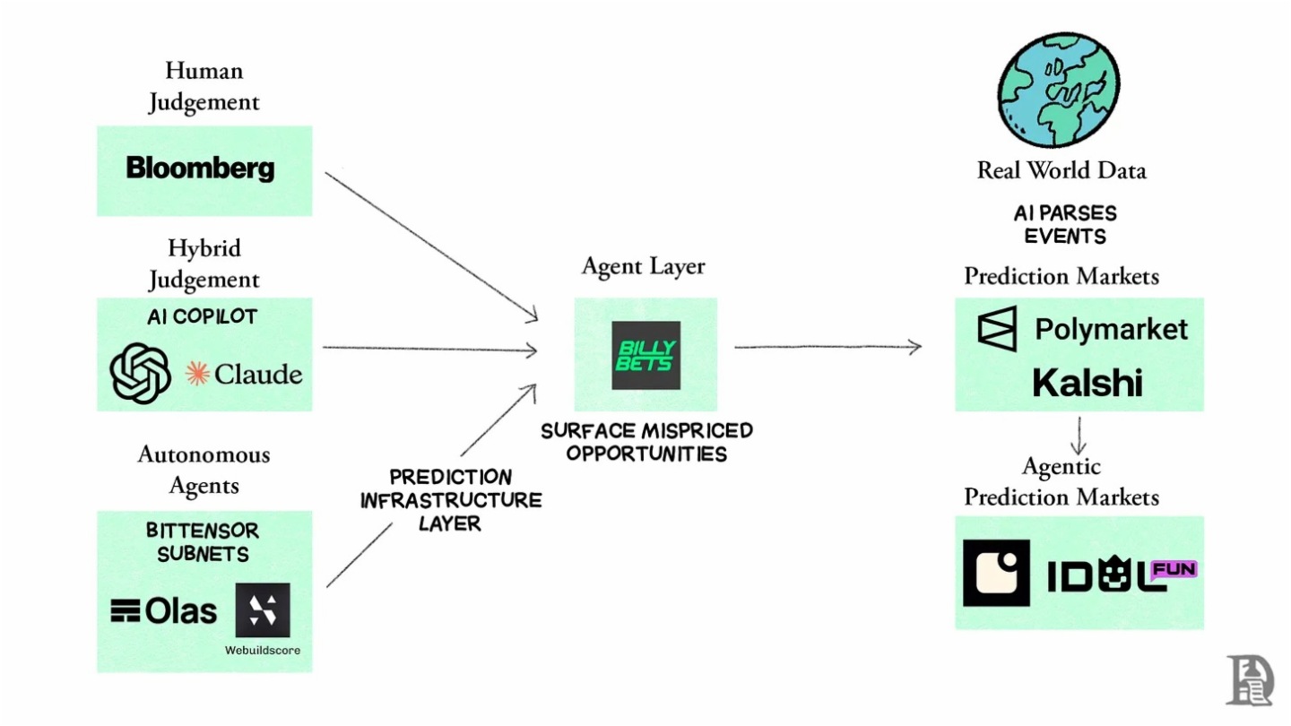 Talus 正致力於實現智能體預測市場的最終環節。其 Nexus 平台允許任何人在鏈上快速部署 AI 智能體。據他們所言,AI 智能體將全面滲透預測市場,因其兼具智能體賴以生存的兩大特質,即信息密度與價格敏感性。 在高頻信息環境下,交易優勢可能在數分鐘内顯現又消失。人類預測者根本無力同時監控政治、體育和宏觀數據等數千個事件。相比之下,AI 智能體能解析數百個信息流,提取潛在關聯,並在信號變動瞬間作出反應。具體運作機制可參閱 Nexus 技術文檔。 智能體既能提供事件定價背景,又能注入流動性。這將社交媒體上的爭吵攻讦轉化為可量化的概率,並將形成觀點所需的數據量壓縮至單一數值。這是否為最佳決策方式尚待觀察,但若智能體網絡真正崛起,預測市場必將扮演關鍵角色。