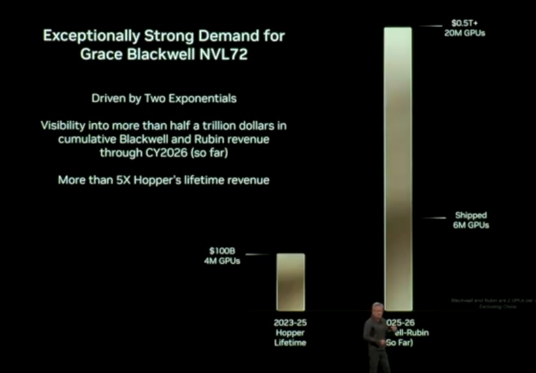 4、焦點信息:Blackwell 目前交付了 600 萬顆,預計 Blackwell+Rubin 將在未來 5 個季度(至 2026 年底)創造 5000 億美元收入,出貨 2000 萬顆,是 Hopper 生命周期出貨的 5 倍。