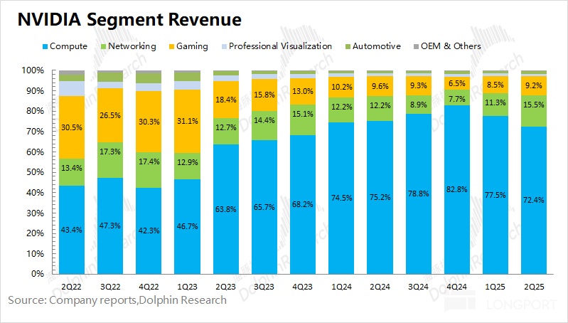 從英偉達的業務情況看,數據中心業務已經成為公司最大的收入來源,佔比接近 90%。數據中心業務中又可以細分為計算收入和網絡收入兩部分,上述 3500 億美元的數據中心 GPU 收入屬於計算收入範疇,通過計算收入與網絡收入間的比例關係,可以推測公司未來 5 個季度的數據中心收入將達到 4200 億美元以上。