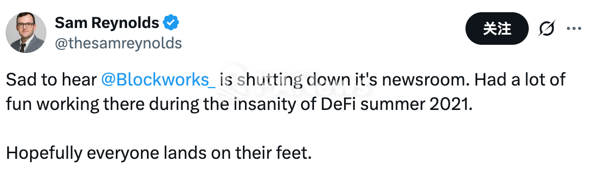 PANews 10月29日消息,據前Blockworks記者Sam Reynolds在X平台透露,加密媒體Blockworks已決定關閉其新聞編輯部。目前Blockworks官方尚未發表正式公告。