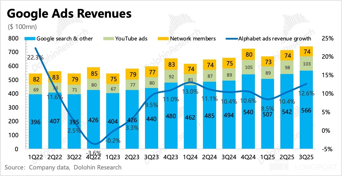 (2)意外的是搜索,不僅沒有在高基數上放緩,並且還更快加速,這就更談不上是否有 AI 侵蝕的問題了。從調研來看,增長驅動主要來自於AI Overviews、AI Mode 對搜索查詢量的提升,從而帶動展示量的增加。