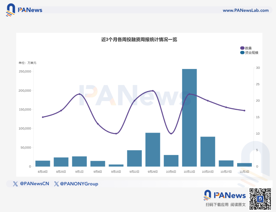 據 PANews 不完全統計,上周(10.27-11.2)全球區塊鏈有17起投融資事件,資金總規模超0.92億美元;此外,上市公司加密資産儲備融資總額超4.68億美元,概覽如下概覽如下: