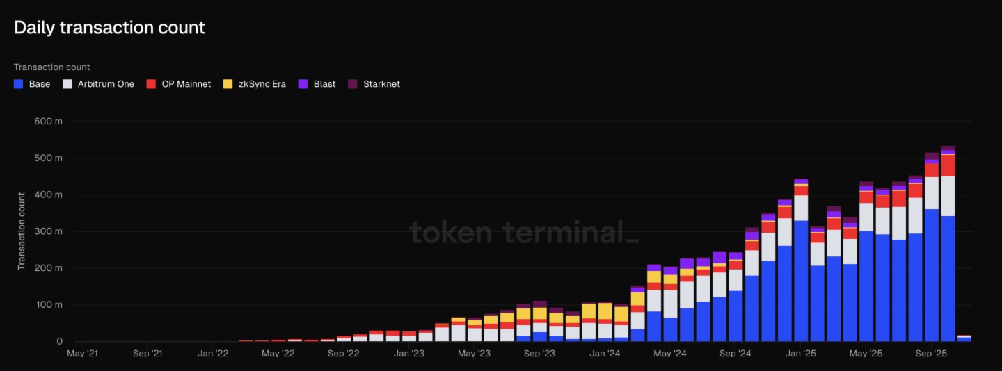 根據Token Terminal最新數據,以太坊Layer2網絡的月交易量持續強勁增長,今年10月總計完成超過5.3億筆交易,創下歷史新高,是同期主網(4800萬筆)的11倍左右。在各L2網絡中,Base以絕對優勢貢獻64.2%的交易量(約3.4億筆),成為生態中最活躍的鏈,其交易激增或受到發幣計劃的刺激。其次是Arbitrum One和OP Mainnet,交易佔比分別約為15%和12%。