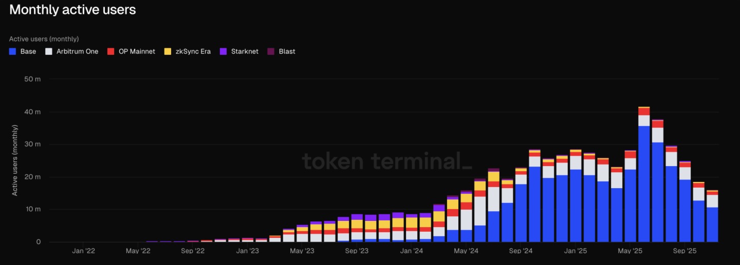 從月活躍用戶數據來看,L2網絡在10月呈現下滑與分化加劇的趨勢。Token Terminal 最新數據顯示,L2月活躍用戶達1610萬個,較今年6月的歷史峰值4170萬個下滑了61.4%,但遠超過以太坊主網的830萬個。其中,Base仍保持絕對領先,佔比達67.1%,但用戶增速較前幾個月明顯放緩;Arbitrum One緊隨其後,佔比22.9%,表現相對穩定;zkSync Era、Starknet和Blast等其他鏈用戶流失較歷史峰值也較為明顯。
