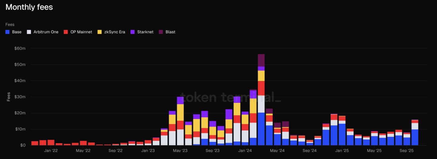 而L2網絡的費用在近期也出現顯著回暖。從每日手續費收入(Fees)來看,自2024年5月達到歷史峰值超5.6億萬美元後,L2板塊整體呈現斷崖式下滑趨勢。盡管期間Dencun升級大幅降低了數據成本、更多L2項目擴容上綫,但手續費收入並未因此回暖,反而因鏈上活動退潮、Gas敘事降溫以及生態兌現不及預期等多重因素而加速萎縮。到2025年10月,整個L2板塊的月度手續費接近1.6億美元,僅為峰值的28.1%,但創下今年2月以來新高。其中,Base、Arbitrum One、OP Mainnet三者佔據了總手續費的約98.3%。