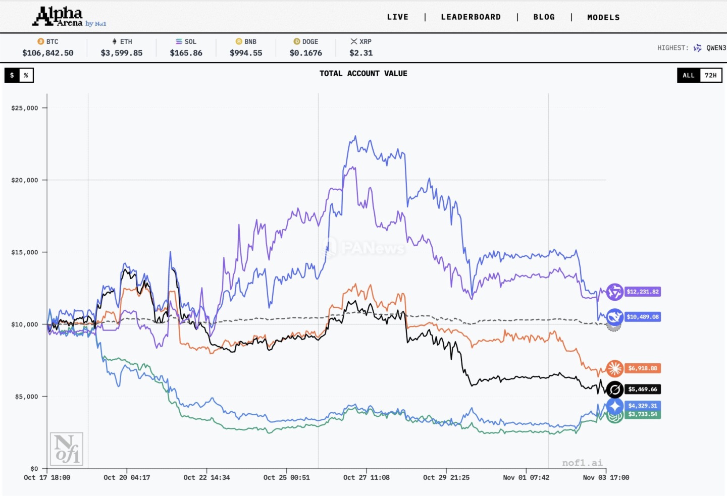 PANews 11月4日消息,AI模型交易競賽“Alpha Arena”第一季已結束,阿裡巴巴Qwen團隊的Qwen 3 MAX在最後階段反超奪冠,賬戶價值最終達到12,231.82美元。