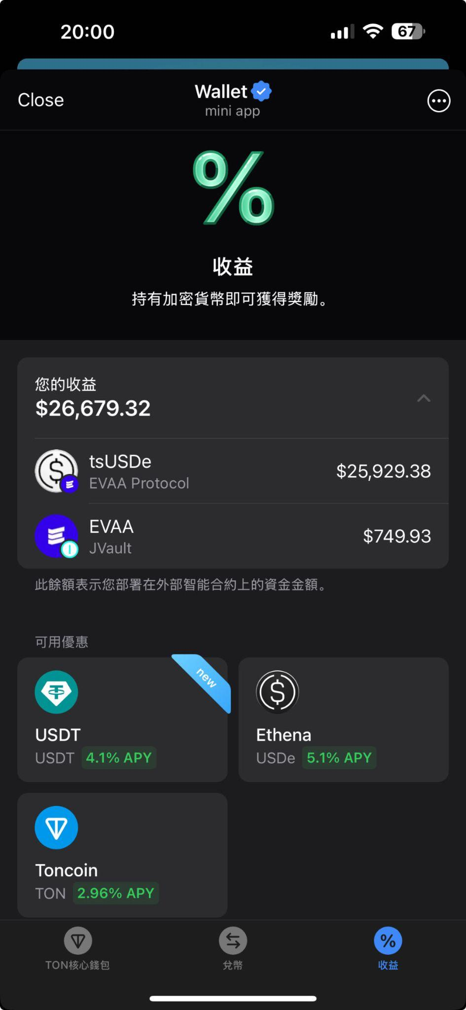 如今打開Telegram裡的TON錢包,可以看到“Earning”入口,裡面已經有一些産品。例如 USDe:USEe 已經在 TON 上發行,目前 TVL 超過 2 億美金。正常年化大概 6%~9%,但在早期推廣階段我們有補貼,疊加後年化能到 16%~19%。John稱,目前第一輪補貼已經結束,下一輪補貼會和“社交推薦”掛鈎。“用多級社交裂變拉新,這是非常符合 TON 社交分發優勢的一條路。"