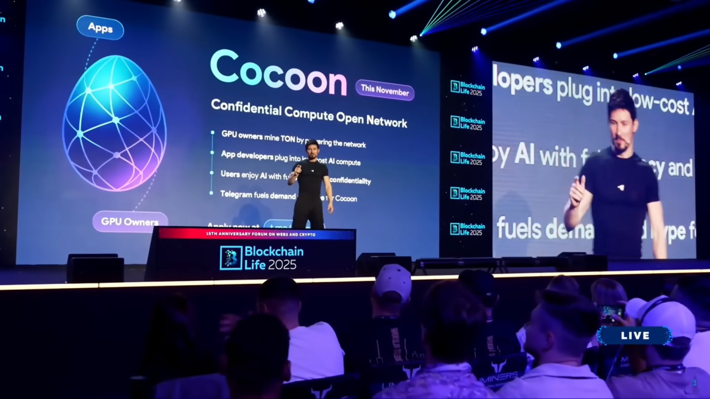 除此之外,Telegram的創始人上周三的迪拜Blockchain Life大會上,宣佈推出Cocoon(Confidential Compute Open Network) 網絡協議,一個安全和保護用戶隱私地執行AI推理計算的去中心化網絡。通過這個網絡,AI應用開發者可以使用TON代幣支付GPU擁有者處理推理請求。Telegram自己將是第一個使用Cocoon處理保密AI請求的主要客戶。