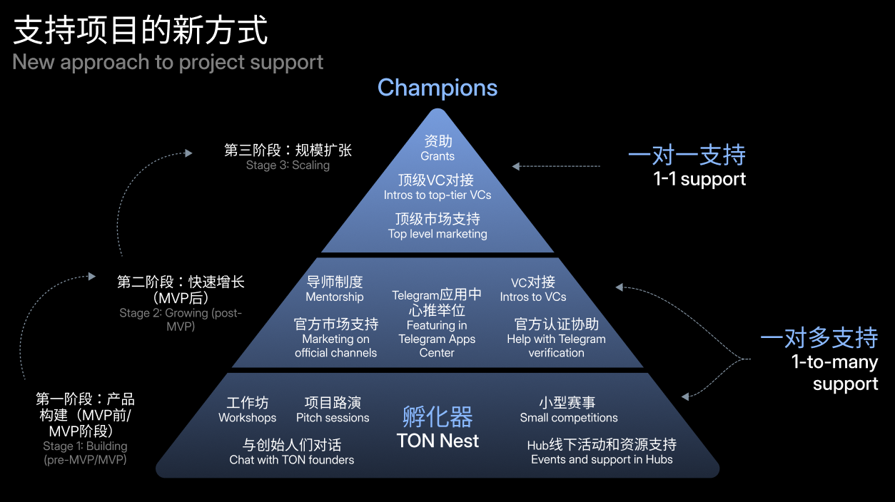 再往上,就是第三層,也就是規模擴張階段。這個階段基本對應到已經跑出來、開始要放大的團隊。這個層級的支持會更接近“1 對 1 資源開路”:包括爭取基金會的資助、直接幫你對接頂級 VC、安排更高一級別的市場推廣,變成“TON 生態的代表性項目”。這個層級更多就是 Champions,那也是TON重點押的項目。