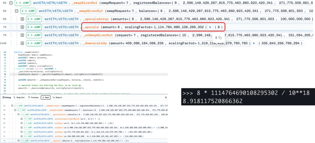 第二階段:攻擊者使用精心構造的數量(= 8),在另一種底層資産(wstETH)與 cbETH 之間進行交換。由於在縮放代幣數量時進行了向下取整(rounding down),計算得到的 Δx 略小(從 8.918 變為 8),從而導致 Δy 被低估,並使不變量 D(來源於 Curve 的 StableSwap 模型)變小。由於 BPT 價格 = D / totalSupply,BPT 價格被人為壓低。