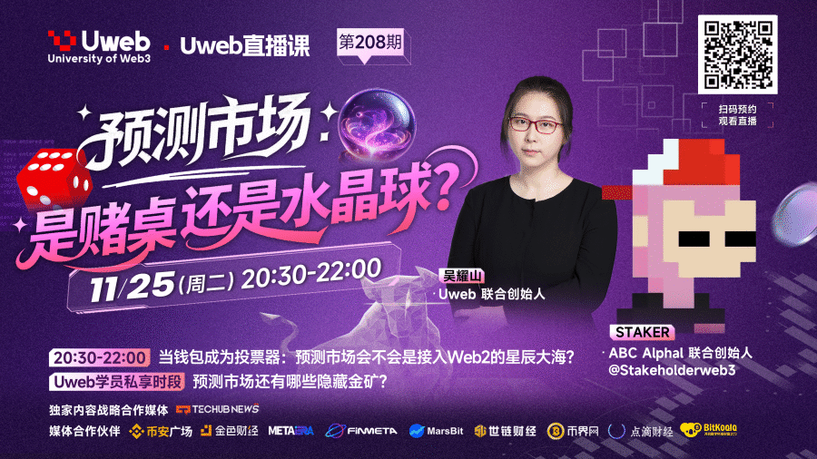 在特朗普成功當選美國總統的推動下,預測市場(Prediction Market)徹底出圈。2024年大選期間,Polymarket單平台投注金額超過20億美元,總市場規模高達37億美元,一舉讓“用真金白銀投票”成為全球最精準的民意溫度計。11月25日晚,Uweb第208期直播請來了ABC Alpha聯合創始人STAKER老師,與吳耀山老師深度拆解了這個賽道:它到底是披著區塊鏈外衣的賭場,還是未來十年最鋒利的信息聚合工具?