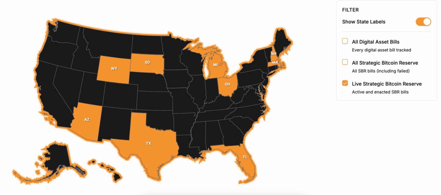 自美參議員 Cynthia Lummis 於去年首度提出「戰略比特幣儲備」構想以來,美國多州立法機構相繼跟進,掀起了一波州級比特幣儲備法案的提案浪潮。今年三月,特朗普簽署行政命令,要求建立國家級比特幣儲備後,這場競賽進一步升溫。 然而,立法進程並非一帆風順。多數州在提案後陷入停滯,部分法案甚至被撤回或直接否決,真正進入實質階段的寥寥無幾。據 Bitcoin Laws 統計,截至目前,全美僅三個州正式通過了州級戰略比特幣儲備法案,按順序依次是亞利桑那州、新罕佈什爾州、以及德克薩斯州。除上述三州之外,目前仍在推進 SBR 法案的也只有佛羅裡達州、南達科他州、懷俄明州、密歇根州、俄亥俄州、馬薩諸塞州。