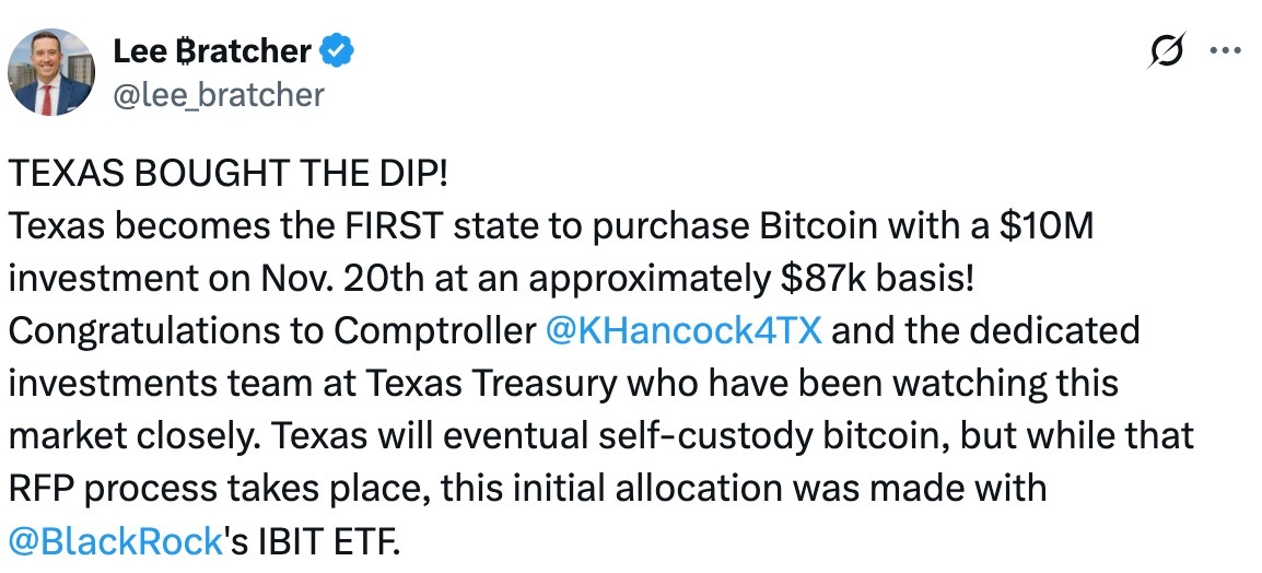當市場還在為短期漲跌爭論不休時,德克薩斯州用真金白銀投下了自己的選票。從今年 1 月末該州副州長宣佈將「比特幣儲備」作為 2025 年立法優先事項,到 2 月州議員 Charles Schwertner 提交 SB 21 法案,再到後續一係列立法審議與程序的推進,最終於 6 月 20 日由州長簽署正式生效,並在上周完成首次配置,這場長達約 10 個月的「長跑」,步伐雖不及市場預期的那般迅捷,卻終究以一筆實實在在的交易塵埃落定。 德克薩斯州區塊鏈協會主席 Lee Bratcher 透露,此次買入發生在 11 月 20 日,既是該儲備的首次資金分配,也是美國首個州級政府配置比特幣的案例。此外,根據德州財政託管信託公司最新提交的 13F 表格,該公司持有價值約 6.67 億美元的 SPY(標普 500 指數 ETF)和 3400 萬美元的 Janus Henderson 基金。若按 Lee Bratcher 所述,購入價值 500 萬美元的 IBIT(作為 1000 萬美元比特幣配置的一部分),將成為該投資組合的第三大持倉。 值得注意的是,Bratcher 特別指出,德州最終目標是實現比特幣的自行託管。目前通過貝萊德 ETF 配置,僅是招標流程完成前的過渡方案。這也預示著,未來德克薩斯州很可能跳過中間機構,直接持有比特幣本身。 或許正如 Bratcher 所言,德州是在「buy the dip」。在市場情緒低迷、價格回調之際,此舉既像是戰略性的「低位佈局」,也為整個加密市場注入了一劑來自官方層面的強心針。它傳遞出了一個明確信號:至少在某些決策者眼中,比特幣的長期價值已然超越波動風險。
