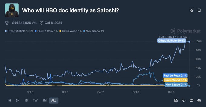 HBO《Money Electric: The Bitcoin Mystery》上映前後,Polymarket 上的一個合約被視為“敘事與事實脫節”的經典樣本:“Who will HBO identify as Satoshi?”。(2024年,10月)