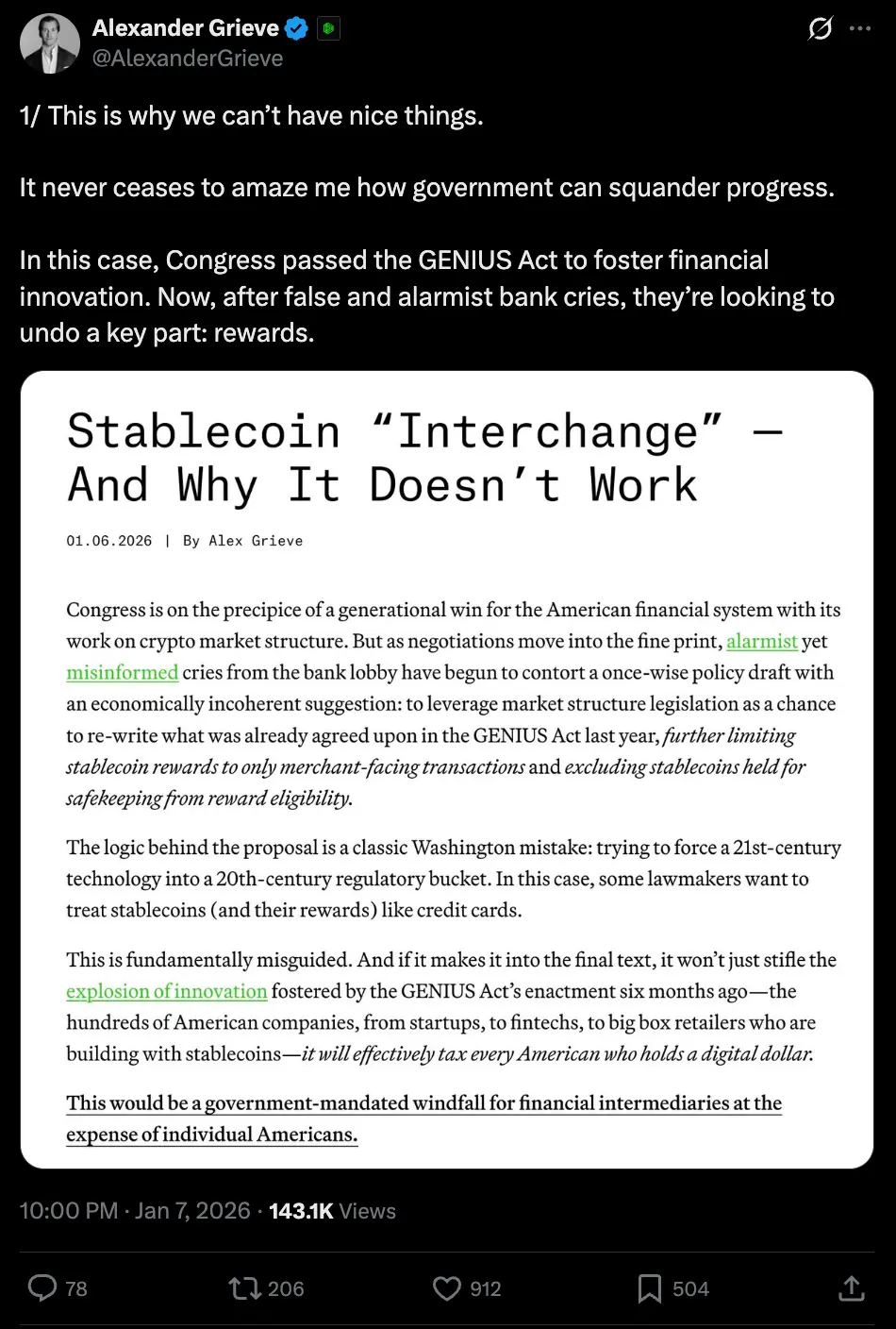另一方面,Paradigm 政府事務副總裁 Alexander Grieve 則將銀行業的訴求定性為「虛假且危言聳聽」的政治幹預。他認為,若立法者被迫修改《GENIUS 法案》中的獎勵條款,強制分銷商禁付收益,實質上等同於對穩定幣持有者徵收「隱性持有稅」,強行讓中間商截留本應屬於消費者的利潤。Grieve 警告,這種為了保護傳統金融利潤而犧牲技術創新的行為,將嚴重削弱美國穩定幣生態的國際吸引力,導致美國在 Web3 金融基礎設施的競爭中全面落後。