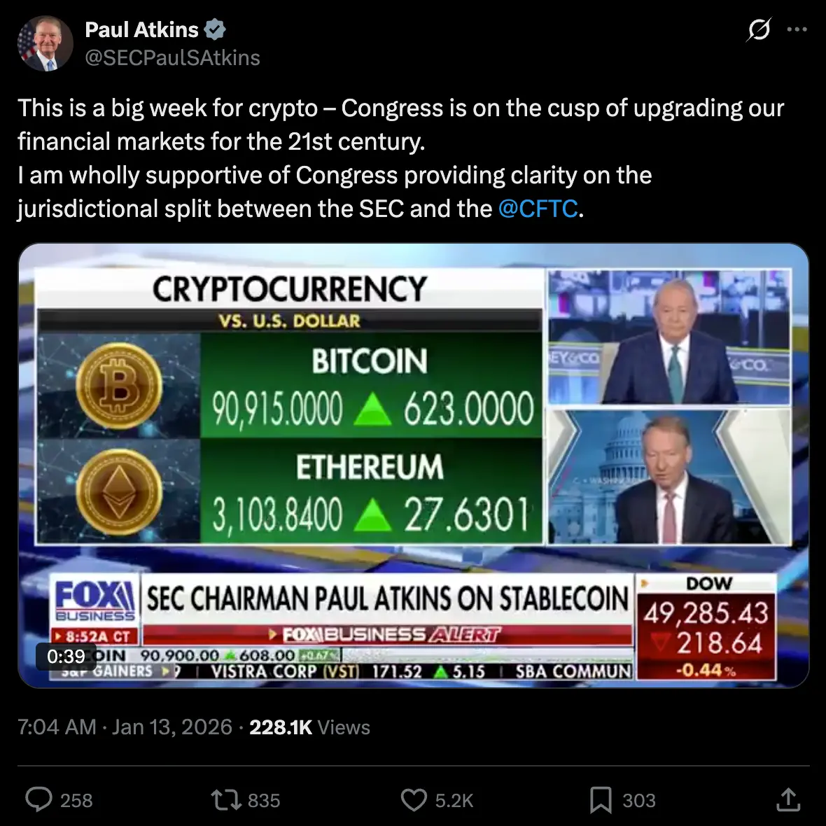 SEC 主席 Paul Atkins 於 1 月 13 日在 X 上發文強調,本周對加密貨幣産業具備裡程碑意義,並公開支持國會明確劃分 SEC 與 CFTC 的管轄邊界,明顯有別於前任主席深受诟病的「執法式監管」,Atkins 支持推動立法框架,力求將加密市場引出監管灰色地帶。