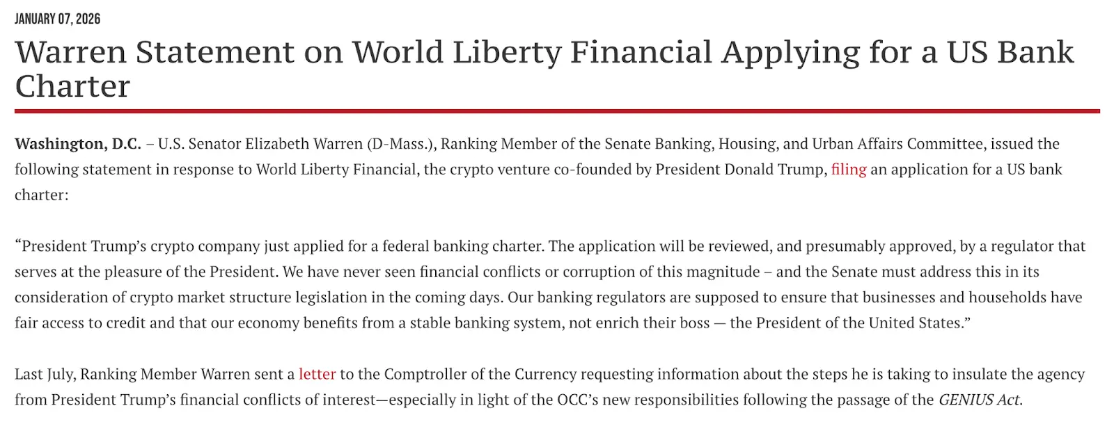 WLF 旗下實體於上周正式向美國貨幣總稽查辦公室 (OCC) 申請「國家信託銀行牌照」。此舉隨即引發政治風暴,爭議核心是:一個由總統親自任命的監管首長,是否有權審核總統家族控股的商業銀行申請?民主黨領袖 Elizabeth Warren 隨即發表聲明,直指其中的利益沖突: