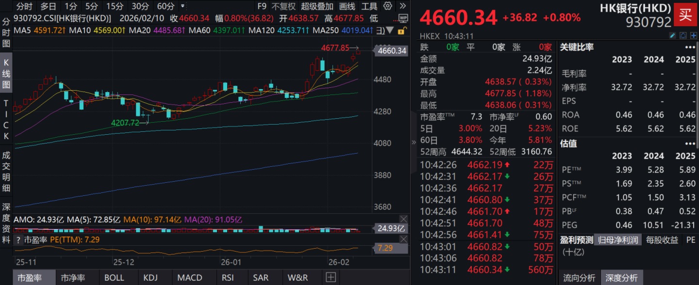 截至2026年2月10日 10:40,HK銀行指數(930792)一度超1%,成分股大新銀行集團(02356)上漲7.29%,大新金融(00440)上漲4.64%,民生銀行(01988)上漲2.99%,中信銀行(00998)上漲1.36%,中國光大銀行(06818)上漲1.18%。