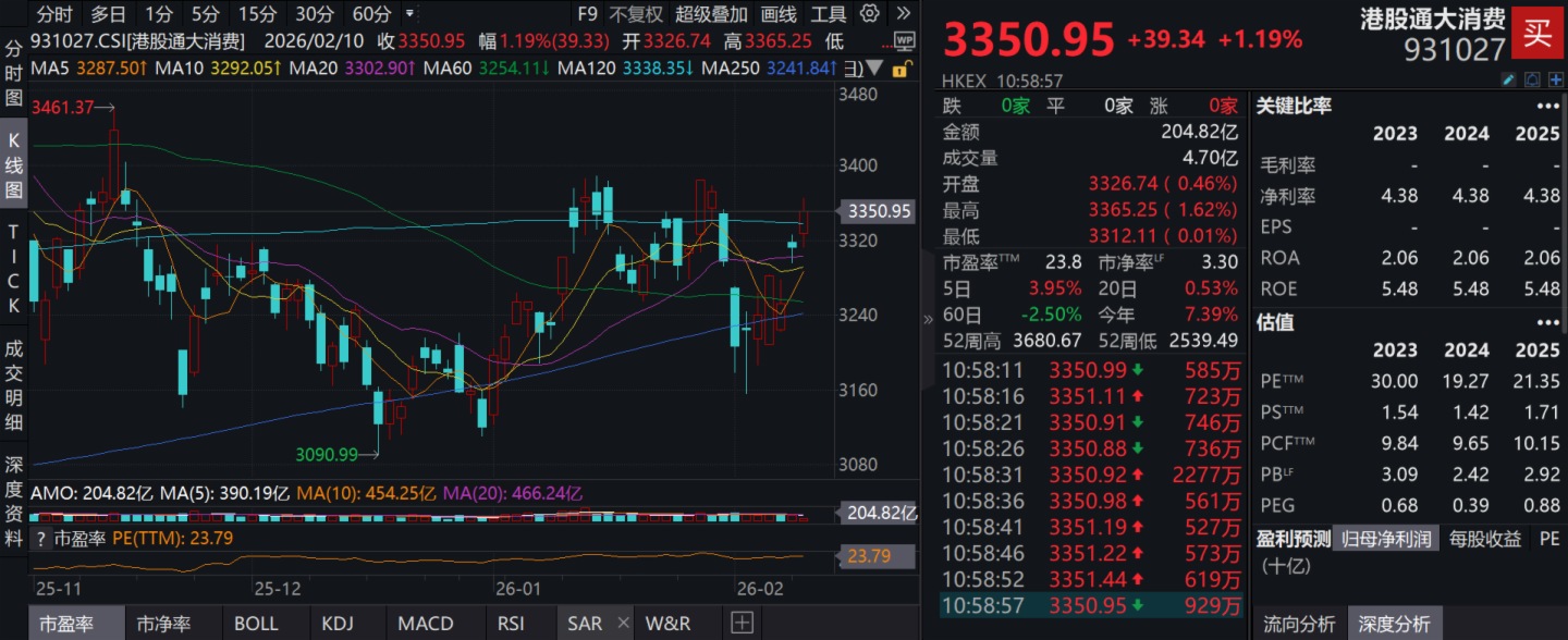 截至2026年2月10日 10:56,港股通大消費指數(931027)強勢上漲1.28%,成分股石藥集團(01093)上漲7.67%,科倫博泰生物-B(06990)上漲6.39%,信達生物(01801)上漲5.97%,藥明生物(02269),康方生物(09926)等個股跟漲。