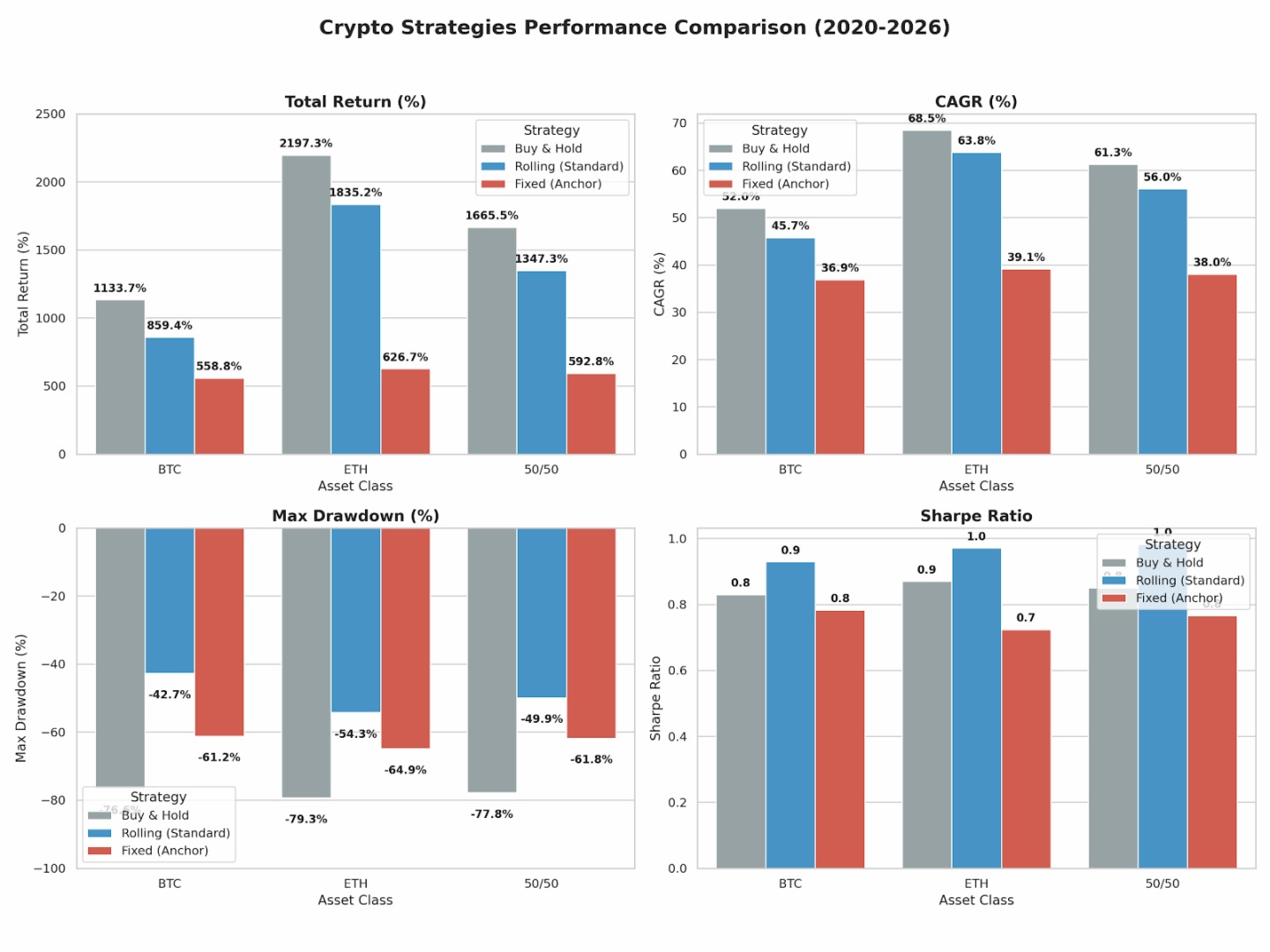 為了探尋真相,我們將 Bitcoin 與 Ethereum 放入 2020-2026 的完整牛熊周期進行回測。在這個涵蓋了暴雷與史詩級大牛市的樣本中,我們對比了兩種截然不同的雙幣贏玩法: