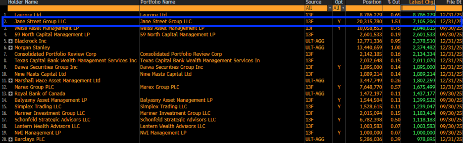 Jane Street 提交的 13F 持倉報告顯示,其在 2025 年第四季度大幅增持了超過 710 萬股貝萊德現貨比特幣ETF (IBIT),總持倉達到 2,031.5 萬股,價值約 7.9 億美元。