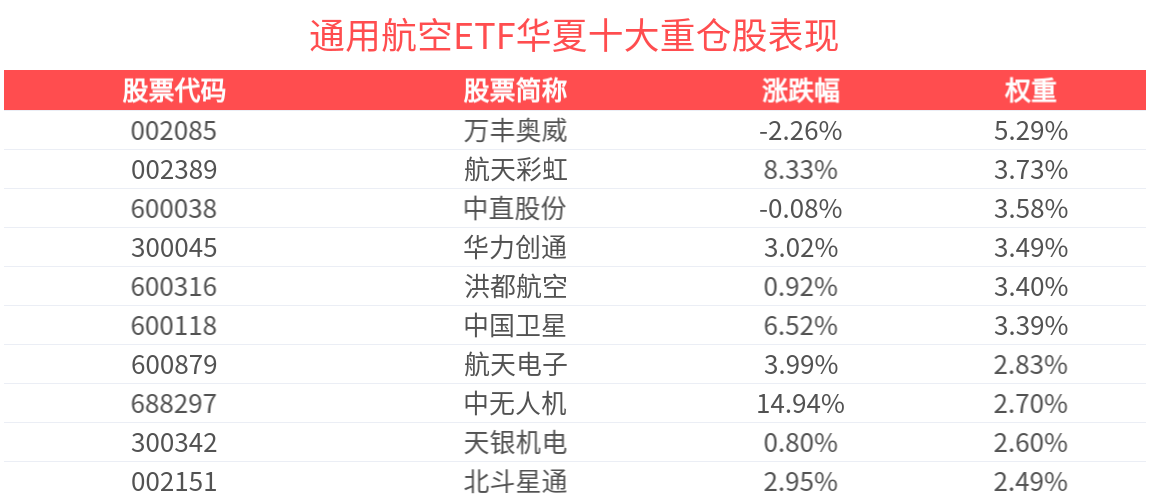 通用航空ETF華夏緊密跟蹤國證通用航空産業指數,截至2026年2月27日,國證通用航空産業指數(980076)前十大權重股分別為萬豐奧威、洪都航空、中直股份、航天彩虹、天銀機電、航天電子、華力創通、中國衛星、應流股份、中無人機,前十大權重股合計佔比34.1%。