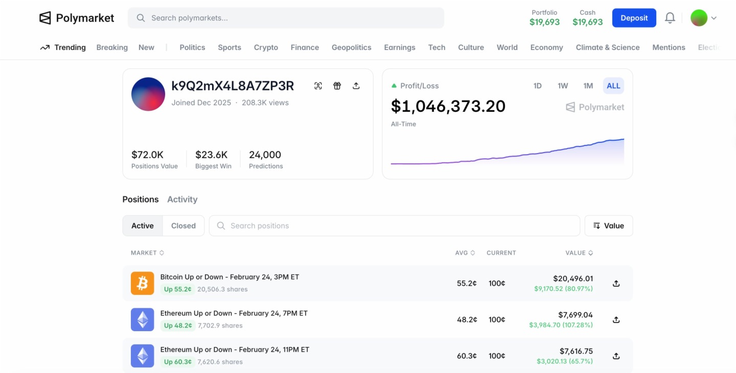 賬戶 k9Q2mX4L8A7ZP3R:總盈利超過 $1,046,373.20,參與了 24,000 次預測 。