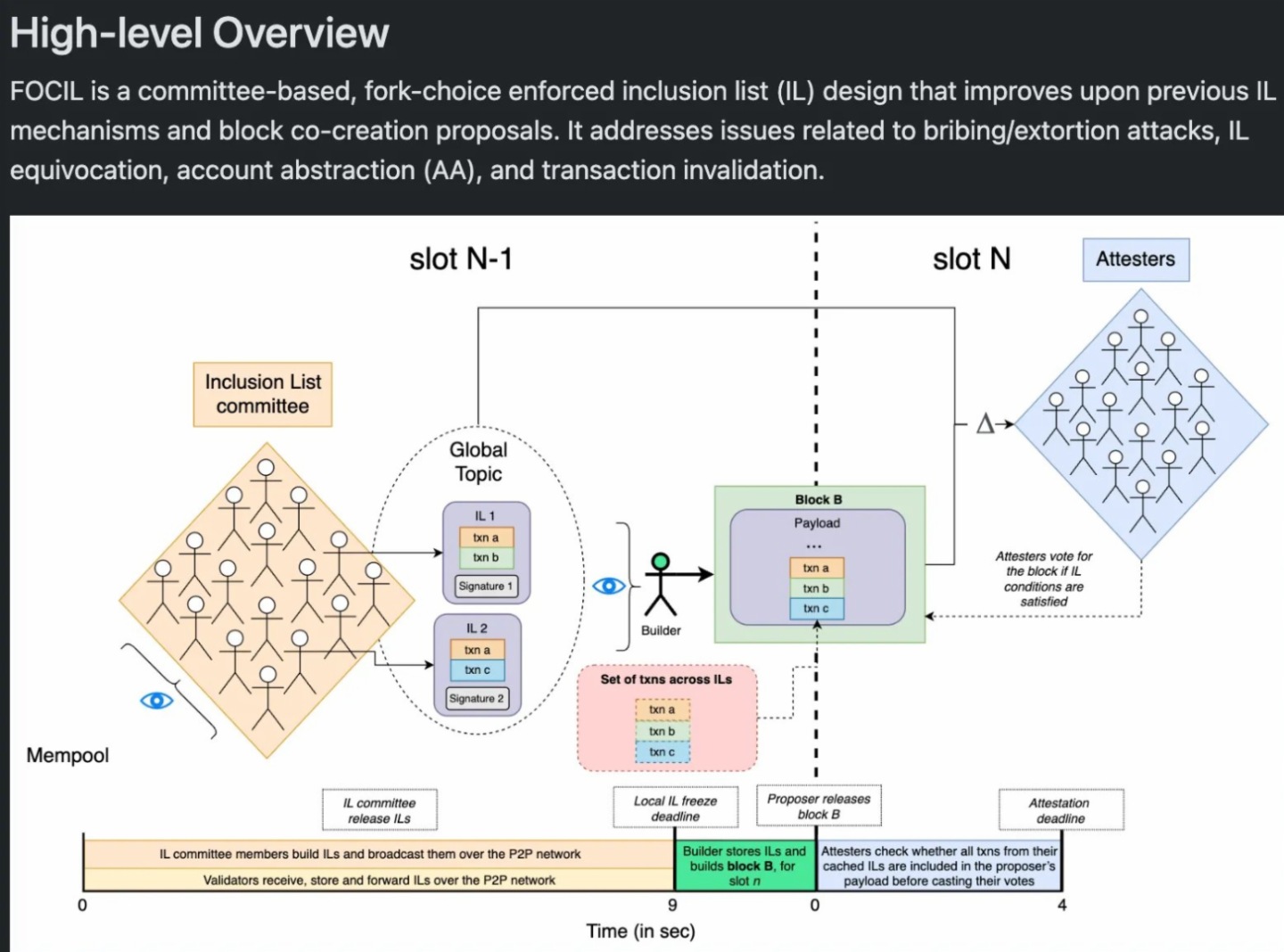 其中每個 slot 會從驗證者集合中選出 Inclusion List Committee,委員會成員根據各自看到的 mempool,形成待納入交易列表並進行廣播;下一個 slot 的 proposer 需要構建一個滿足這些列表約束的區塊,而 attester 則只會為符合條件的區塊投票。