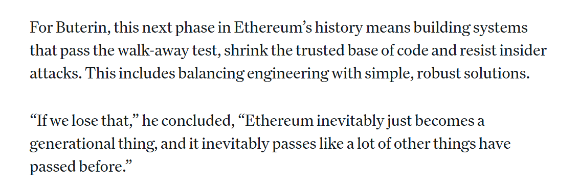 這無疑會讓人聯想到 Vitalik 此前常提及的另一個檢驗以太坊長期價值的標準,即 walkaway test(退出測試),這個測試問的是一個非常樸素的問題,如果以太坊的所有核心開發者明天集體消失,協議還能正常運轉嗎?