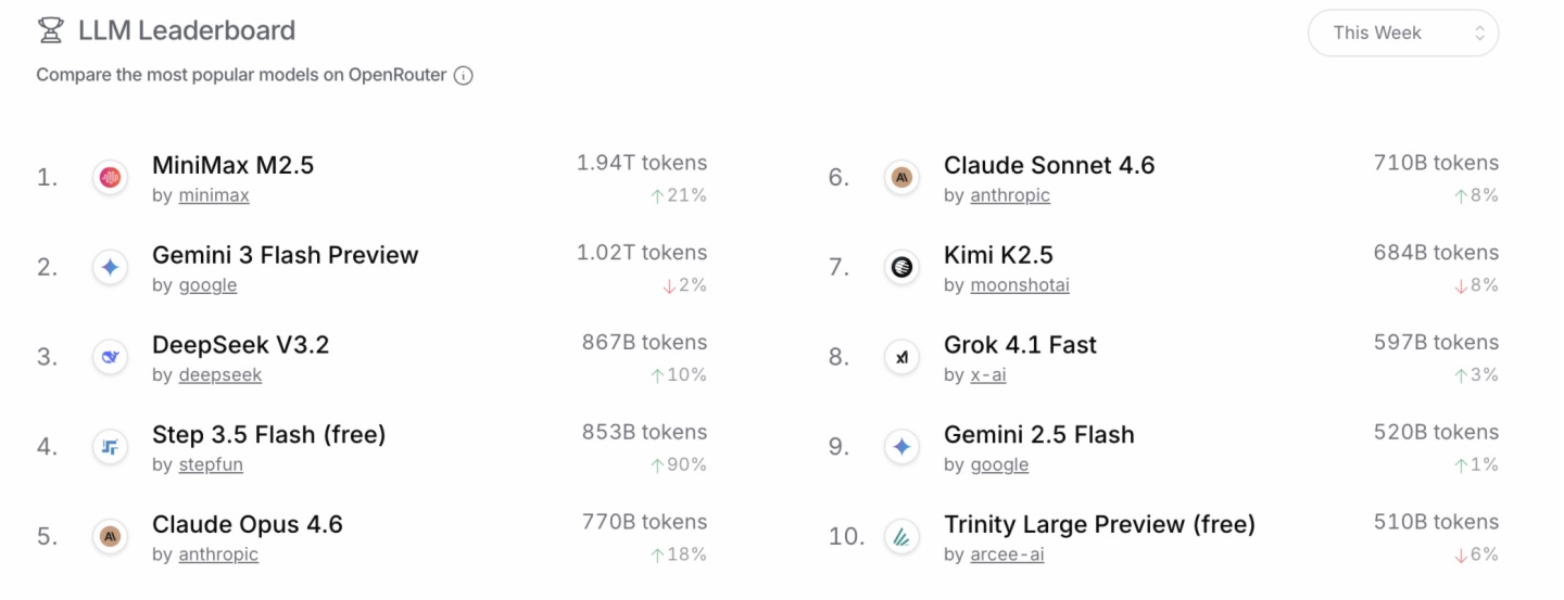 根據全球最大API聚合平台OpenRouter的最新數據顯示,本周全球前十大模型的Token消耗量接近8.5萬億,其中中國的模型已經佔據了全球實際調用量的一半。在榜單中,多個中國模型佔據核心位置,特別是MiniMax M2.5穩居榜首,本周調用量接近2萬億,增長幅度達到21%。