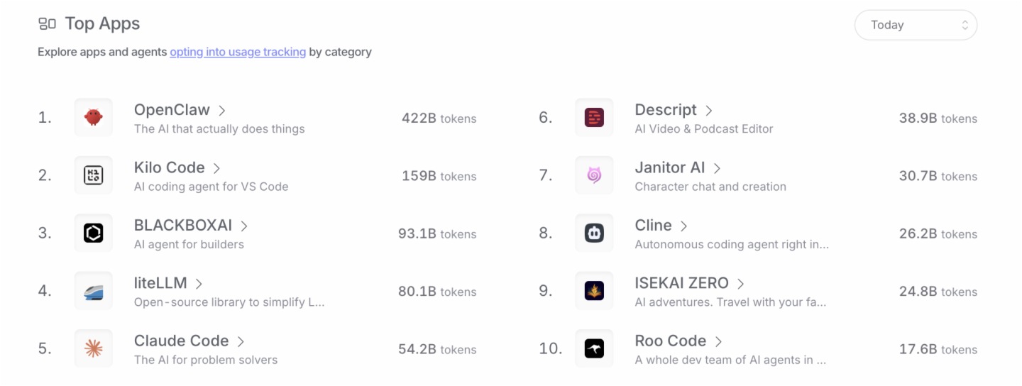 更值得注意的是,OpenClaw是OpenRouter最大的單一應用。本月,其調用量沖至全球第一,是第二名Kilo Code的兩倍多,也是國産大模型出海的關鍵推手。