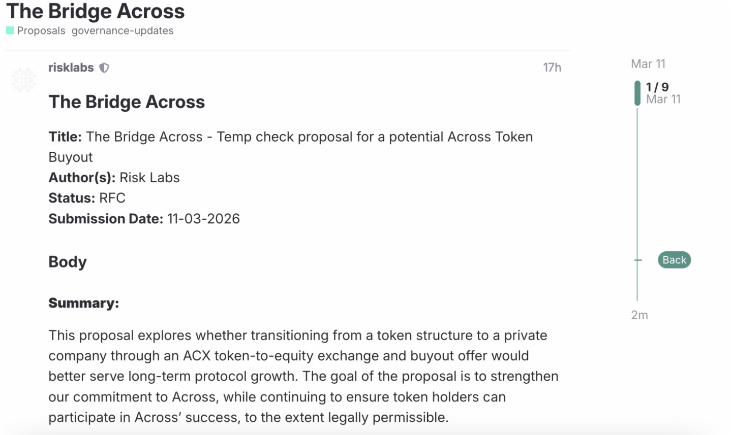 3月11日,Across發佈溫度檢測提案,計劃從DAO結構轉型為美國C型公司。這是Across協議在治理結構上的重要轉變,在加密領域尚屬首例。