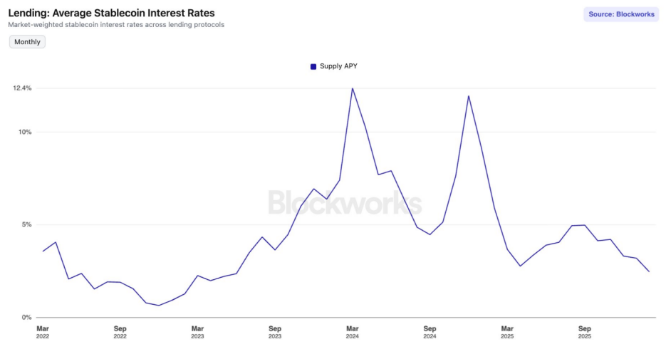 從2025年9月起,DeFi(去中心化金融)市場就進入了“利率寒冬”。主流穩定幣在頭部借貸協議中的平均存款年化收益率(APY)觸及了自2023年6月以來的最低水平。