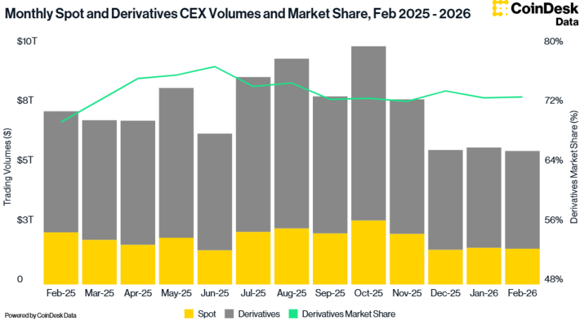 CoinDesk Data也顯示,2月份CEX的總交易量下滑了2.41%,降至5.61萬億美元,這是自2024年10月以來的最低交易量。