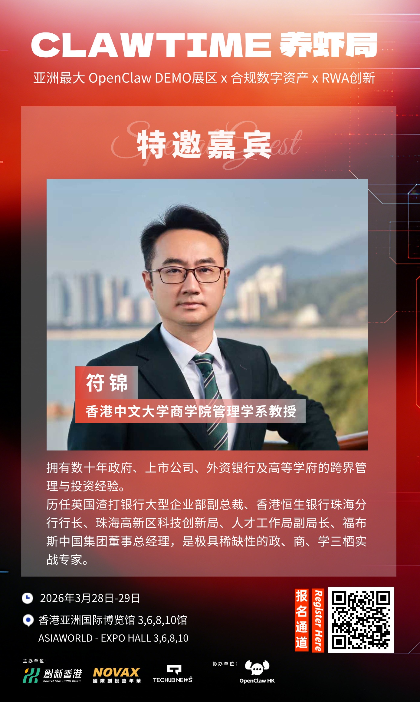 Techub News 消息,香港中文大學管理學係教授 符錦確認出席「CLAWTIME 養蝦局 暨『預見未來 · 創新管理全球領袖營 · 2026 OpenClaw 亞太“養蝦”大巡遊』香港旗艦站」。 符錦 現任