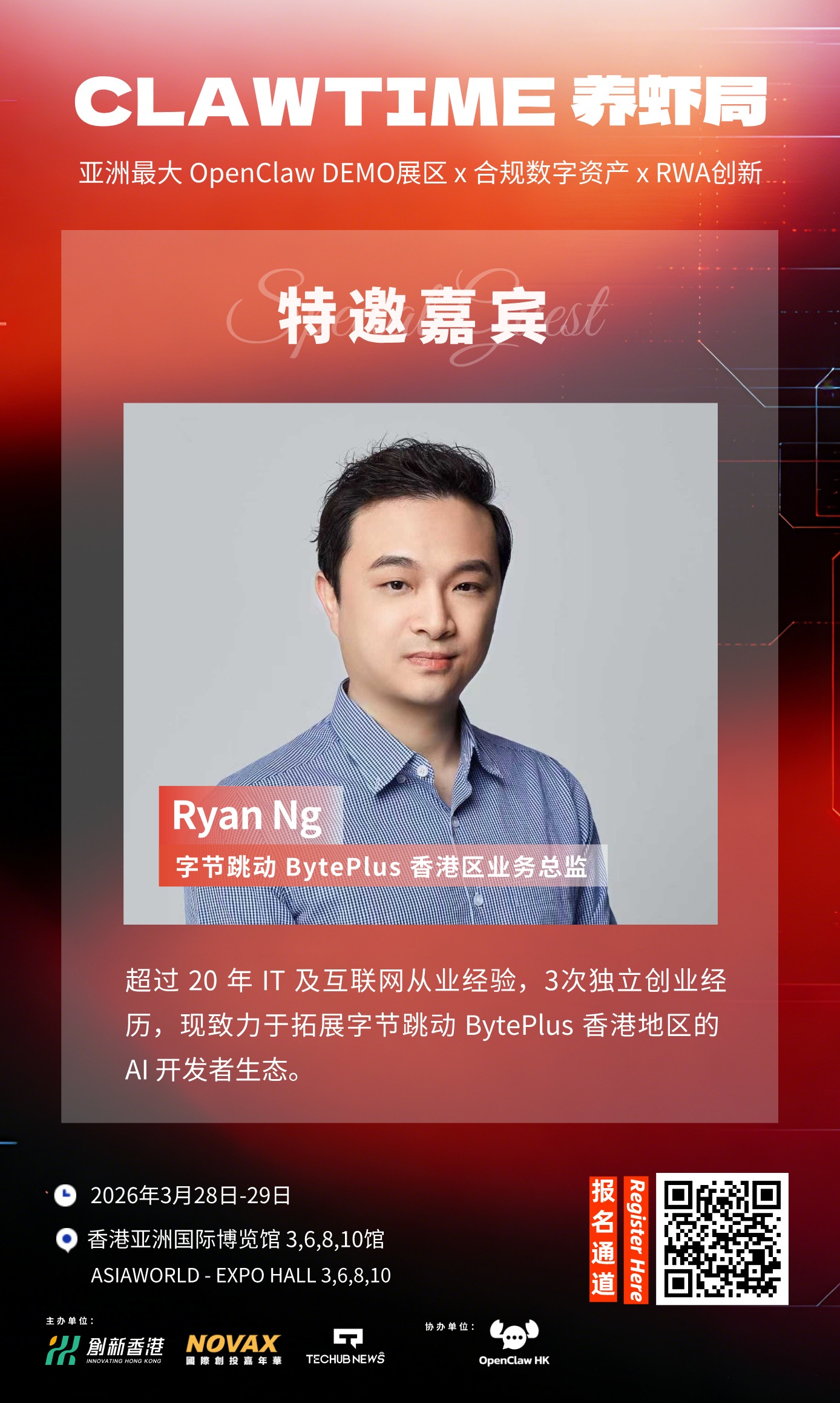 Techub News 消息,字節跳動 BytePlus 香港區業務總監 Ryan Ng 確認出席「CLAWTIME 養蝦局 暨『預見未來 · 創新管理全球領袖營 · 2026 OpenClaw 亞太“養蝦”大巡遊』香港旗艦站」。 Ryan Ng 現任