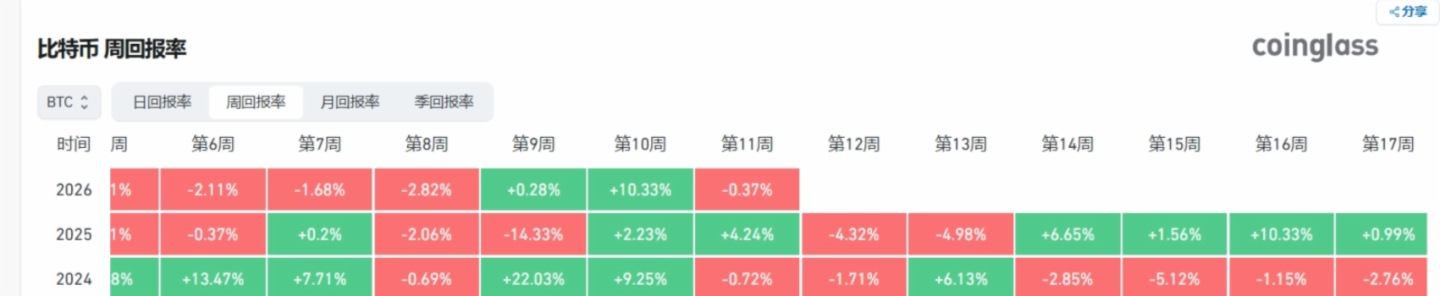 PANews 3月16日消息,據Coinglass數據顯示,比特幣上周回報率約10.33%,追平2025年4月(當年第16周)以來最大單周漲幅。
