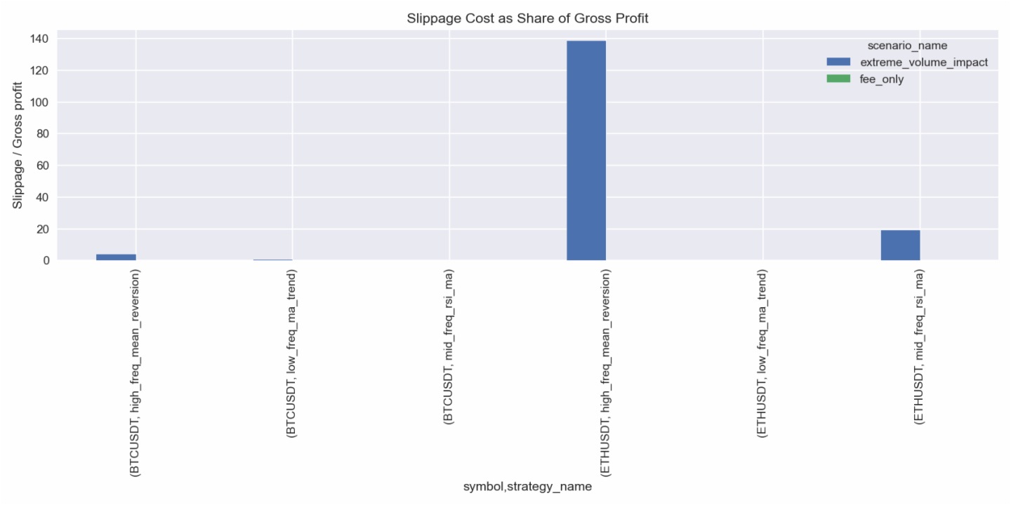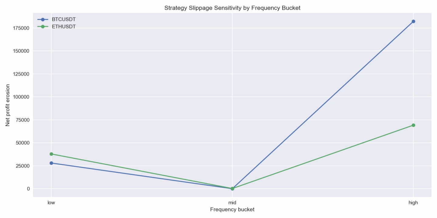 這張圖展示了不同頻率策略的“淨利潤侵蝕量”。高頻策略幾乎是斷崖式地高於中低頻,說明在加密市場裡,滑點的打擊面高度集中於高換手策略。很多高頻係統不是賺不到錢,而是賺得不夠多,抵不過頻繁交易帶來的持續摩擦。