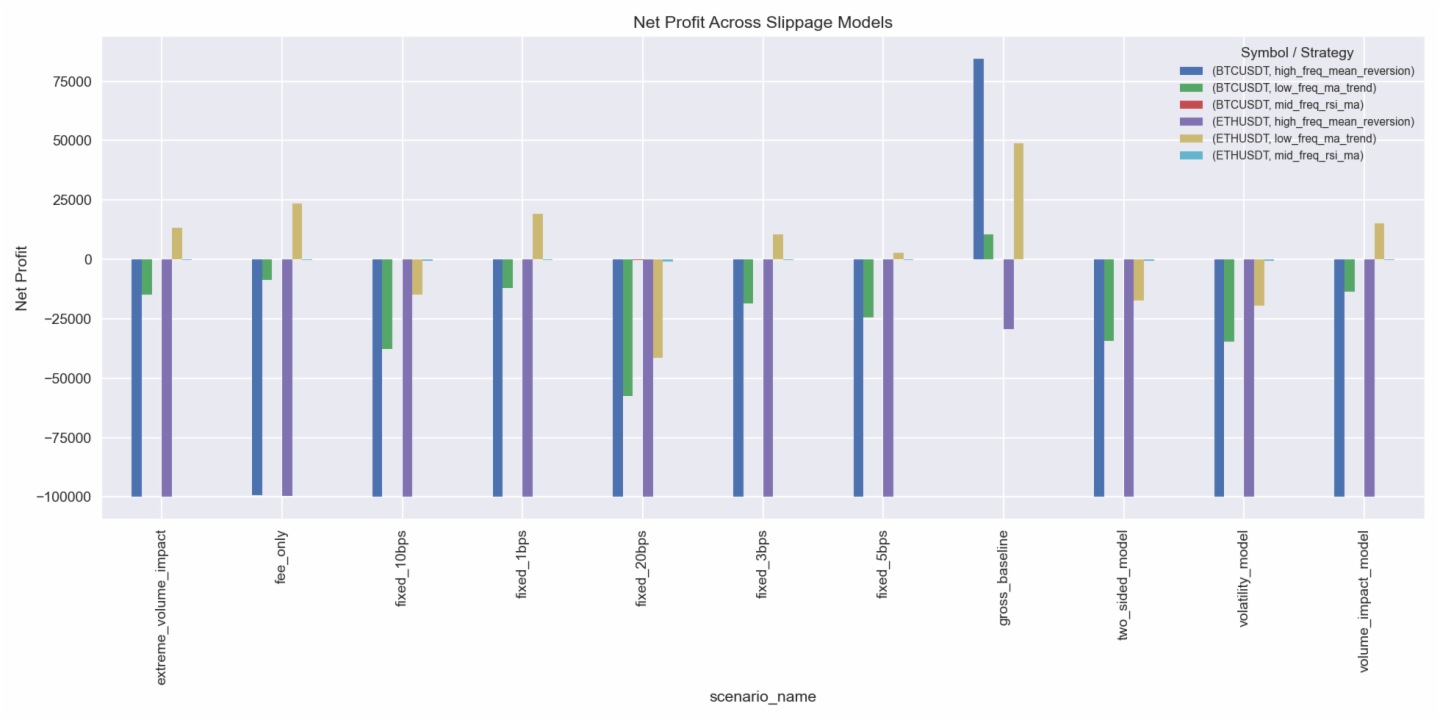 這張圖對比了不同滑點模型下的淨利潤表現。固定 bps 只是成本壓力的起點,當滑點開始和波動、成交量沖擊、極端行情聯動時,策略收益會明顯下沉。對高頻策略而言,模型一旦從“固定滑點”升級到“動態滑點”,利潤往往不是變薄,而是直接消失。