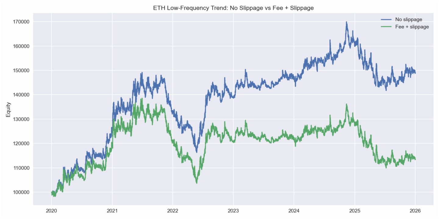 這也是為什麼 `ETH` 低頻趨勢策略雖然仍能盈利,但利潤相較無滑點版本已經明顯被壓縮。它說明 ETH 不是不能做,而是更需要給執行成本留足安全墊。